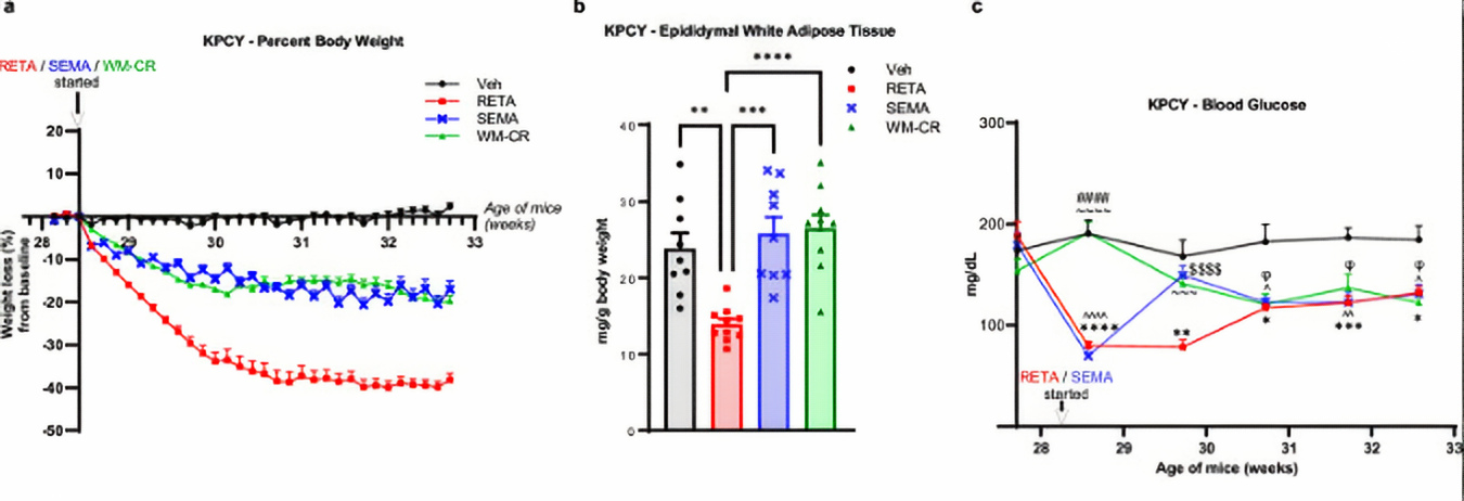 Fig. 1. RETA or SEMA treatment reduces body weight and improves fasting blood glucose.a Percent changes in body weight from baseline are reported. b, Epididymal white adipose tissue weight was quantified at the endpoint. c Fasting blood glucose was quantified at baseline and throughout the study at indicated time points until the endpoint. d Tumor engraftment or “tumor take” is reported.