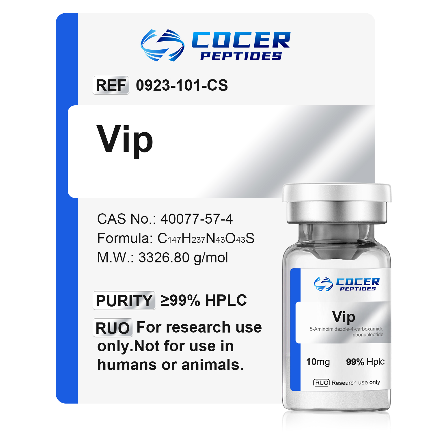 VIP (Vasoactive Intestinal Peptide) is an acidic polypeptide neurotransmitter composed of 28 amino acid residues, belonging to the vasoactive intestinal peptide/glucagon-like peptide family. Primarily synthesized and secreted by the central nervous system, gastrointestinal ganglia, and immune cells, it diffuses to target cells via blood or interstitial fluid. By binding to specific receptors, it exerts physiological effects crucial for vascular regulation, gastrointestinal function control, immune homeostasis, and neuroprotection.